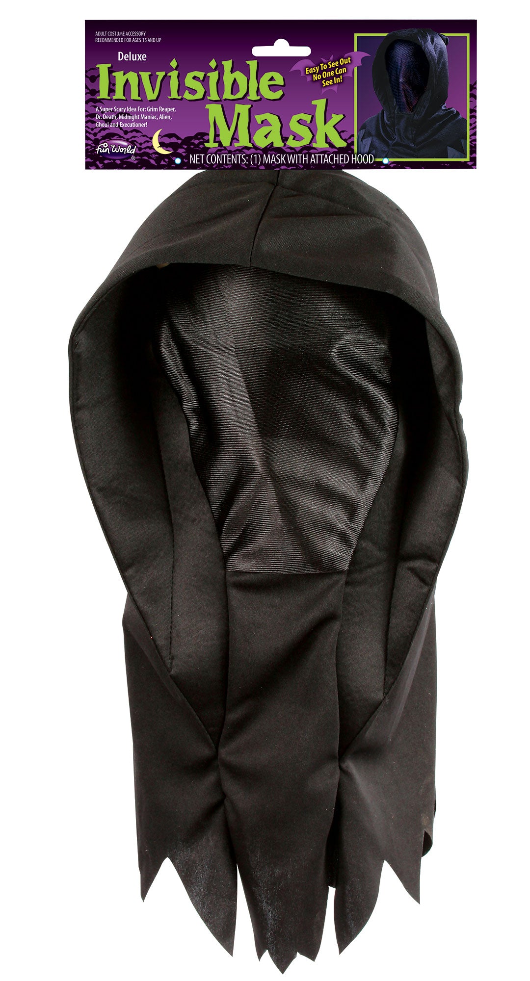 Wow your friends and show off your wicked powers of invisibility with this sweet Halloween mask. Convenient and durable, this shrouded Halloween costume accessory fits over-the-head with ease. Craft your own creative Halloween costume by pairing the mask with a variety of clothing and other costume accessories. And the best part? You can see out, but no one can see in. Imported.Material: FABRIC-MANMADE