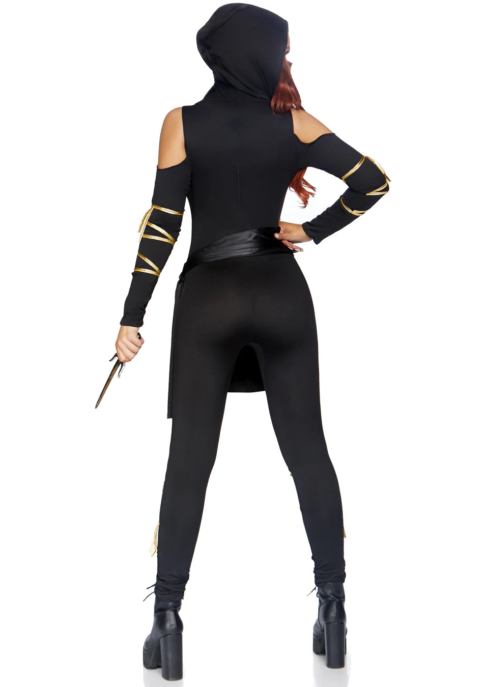 Stay hidden yet looking hot in the 3 PC Stealth Ninja costume by Leg Avenue. This sexy Halloween costume look includes a hooded catsuit, waist sash, and ninja face mask. (Weapon not included)